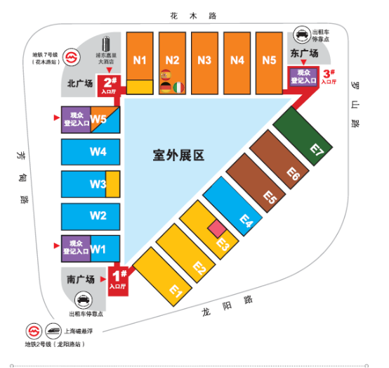 地鐵2號(hào)線,至龍陽路站下,步行10分鐘至展館1號(hào)(南)入口大廳或W1館觀眾入口 地推7號(hào)線,至花木路站下,步行1分鐘至展館2號(hào)(北)入口大廳或W5館觀眾入口