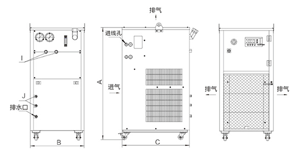 2.冷水機(jī)安裝時(shí),進(jìn)風(fēng)口需預(yù)留≮ 50cm的空間,出風(fēng)口預(yù)留≮150cm的空間;