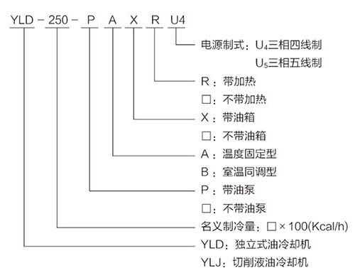 YL 型油冷卻機可分為 YLD 型獨立式油冷卻機和 YLJ 型浸入式油冷卻機。YLD 型獨立式油冷卻機獨立于工作主機或液壓站的油箱安裝,通過進/出油管與油箱連通,有自帶循環(huán)油泵(PA/PB 型)或無泵需外配循環(huán)油 泵(A/B 型)兩種。A/B 型表示溫度控制方式:A 型是溫度固定型控制方式,B 型是室溫同調(diào)型控制方式。控制方式在出廠時已設(shè)定好。