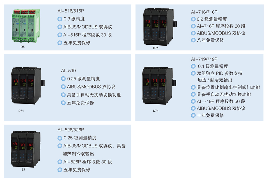 ①儀表的主機型號為AI-516,通用型人工智能溫度控制器/調(diào)節(jié)器,0.3級測量精度,具備多分度輸入、調(diào)節(jié)或變送(占用主輸出)、報警及通訊功能。