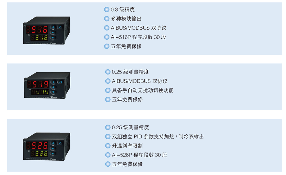 AI系列通用型人工智能溫度控制器/調(diào)節(jié)器——功能完善通用性強(qiáng)的人工智能溫度控制器/調(diào)節(jié)器。產(chǎn)品按十年以上壽命設(shè)計(jì),五年免費(fèi)保修。產(chǎn)品規(guī)格豐富,可按客戶(hù)行業(yè)提供多種不同功能的型號(hào),交貨迅速且維護(hù)方便。